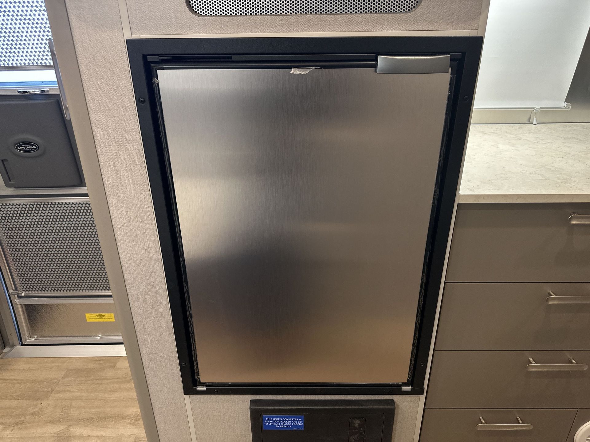 Inside, the 20FB features a thoughtfully designed floor plan that maximizes every inch of space. The front bedroom includes a cozy double bed with ample under-bed storage, providing a restful retreat after a day of exploration. The rear kitchen is equipped with a three-burner stove, convection microwave, and a compact refrigerator, making meal preparation convenient and enjoyable. The central dinette offers a comfortable area for dining or relaxation and can convert into additional sleeping space for guests.