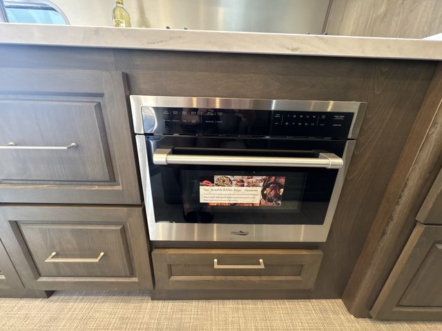 The kitchen is equipped with high-end appliances, including a three-burner gas stove, oven, convection microwave, and a mid-size refrigerator, facilitating easy meal preparation. The large stainless steel sink and generous counter space enhance the cooking experience. A powered dinette comfortably seats four and can convert into an extra sleeping area with the touch of a button.