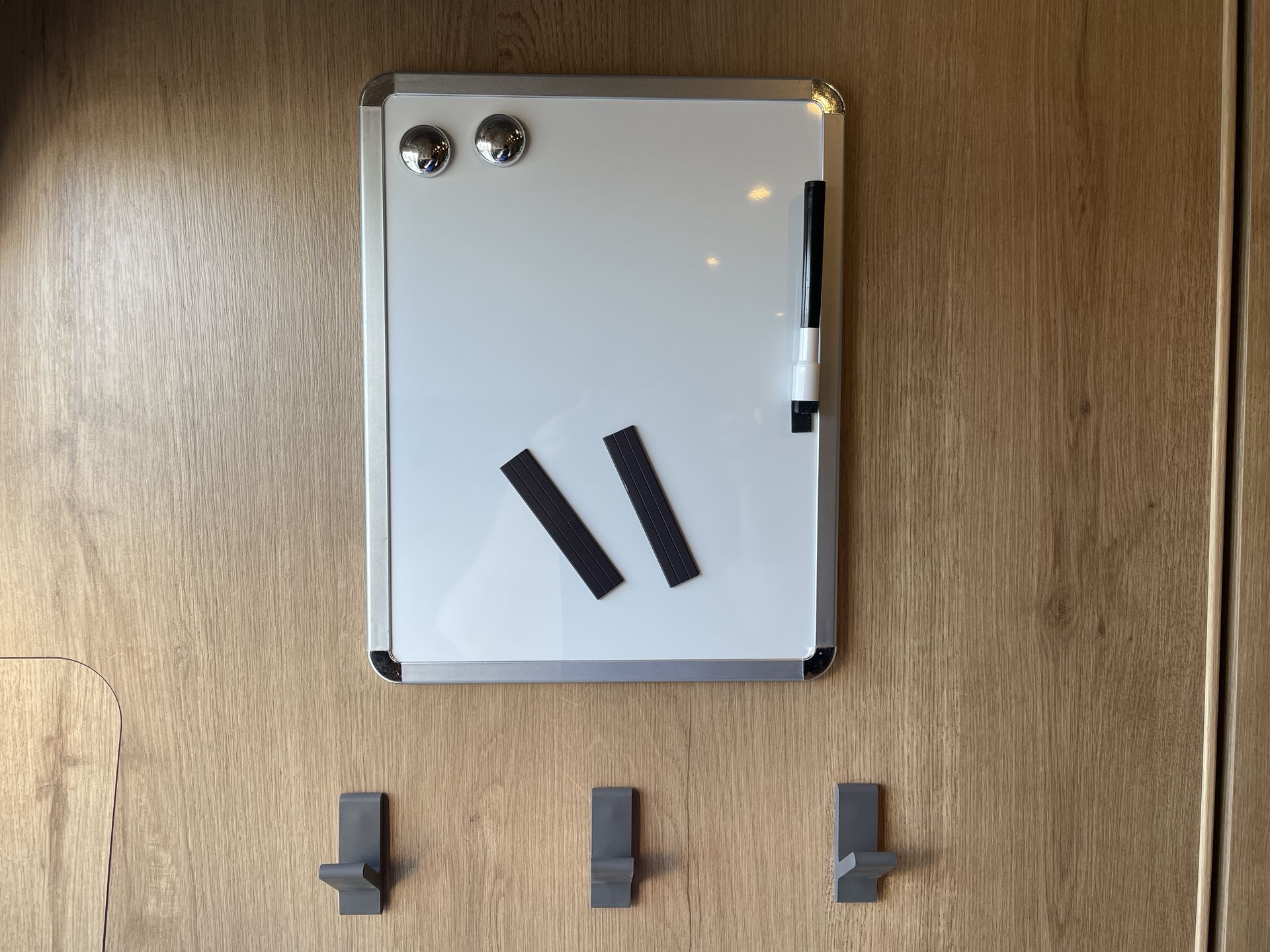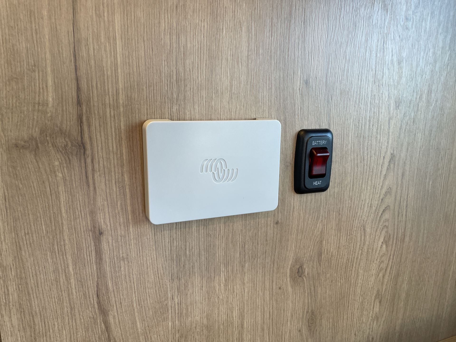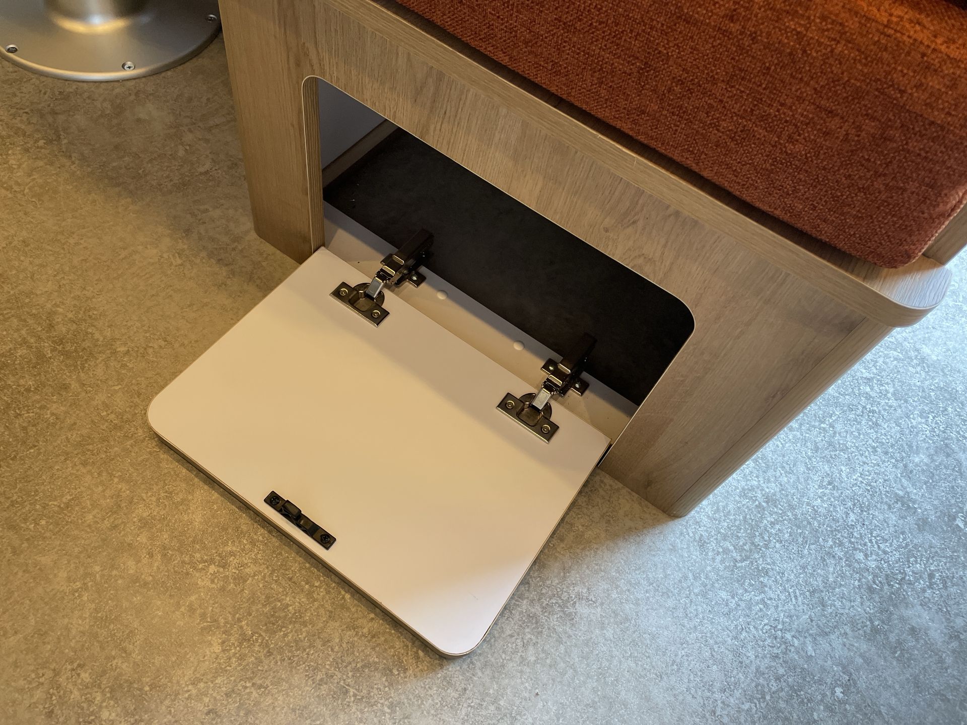 The rear bathroom is both practical and stylish, featuring a reeded glass shower door, removable handheld shower head, and a retractable clothesline for added convenience. A recirculating water heater ensures efficient water usage during your travels.