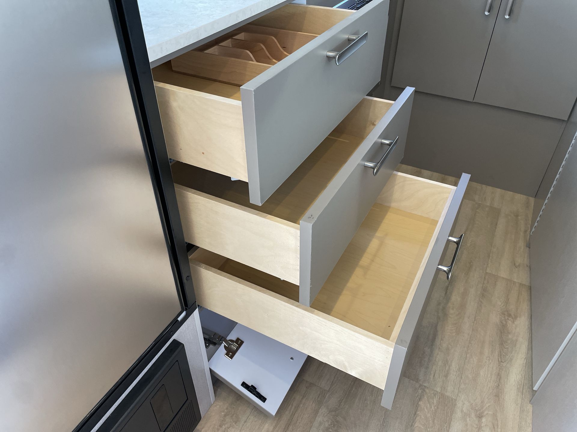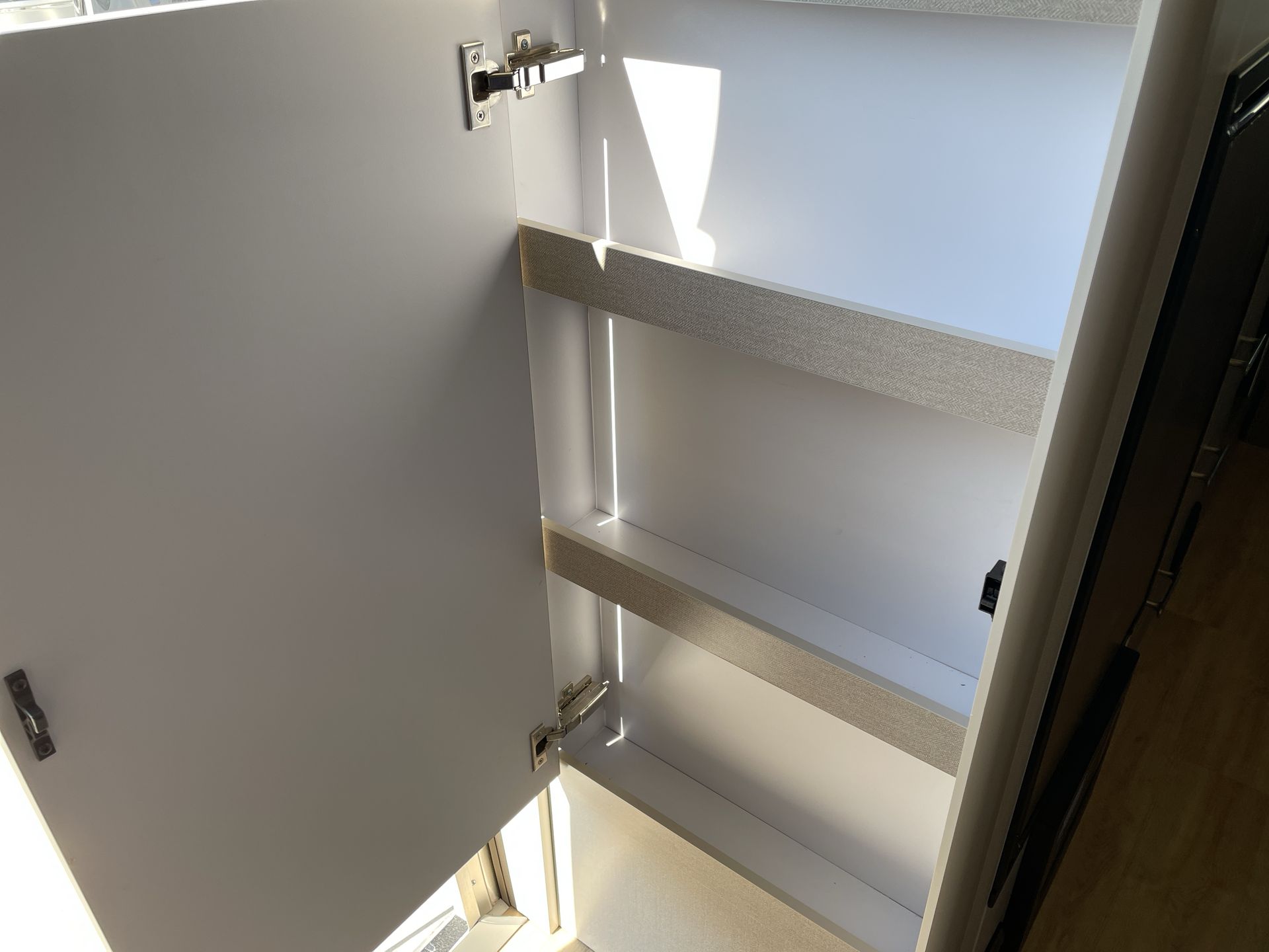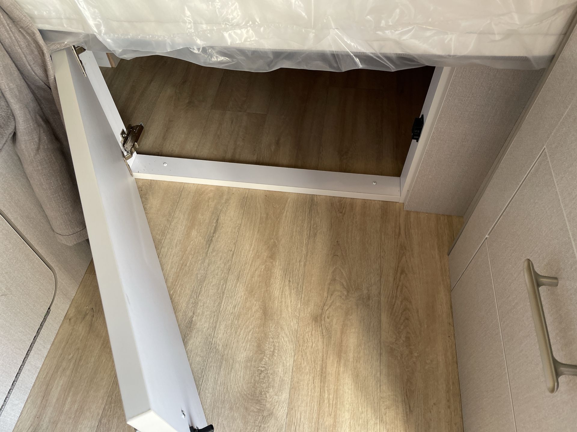 The bathroom, located at the rear, includes a spacious shower, a plastic toilet, and sufficient storage for toiletries and towels. With vinyl flooring throughout, cleaning is a breeze, allowing more time to enjoy your travels.