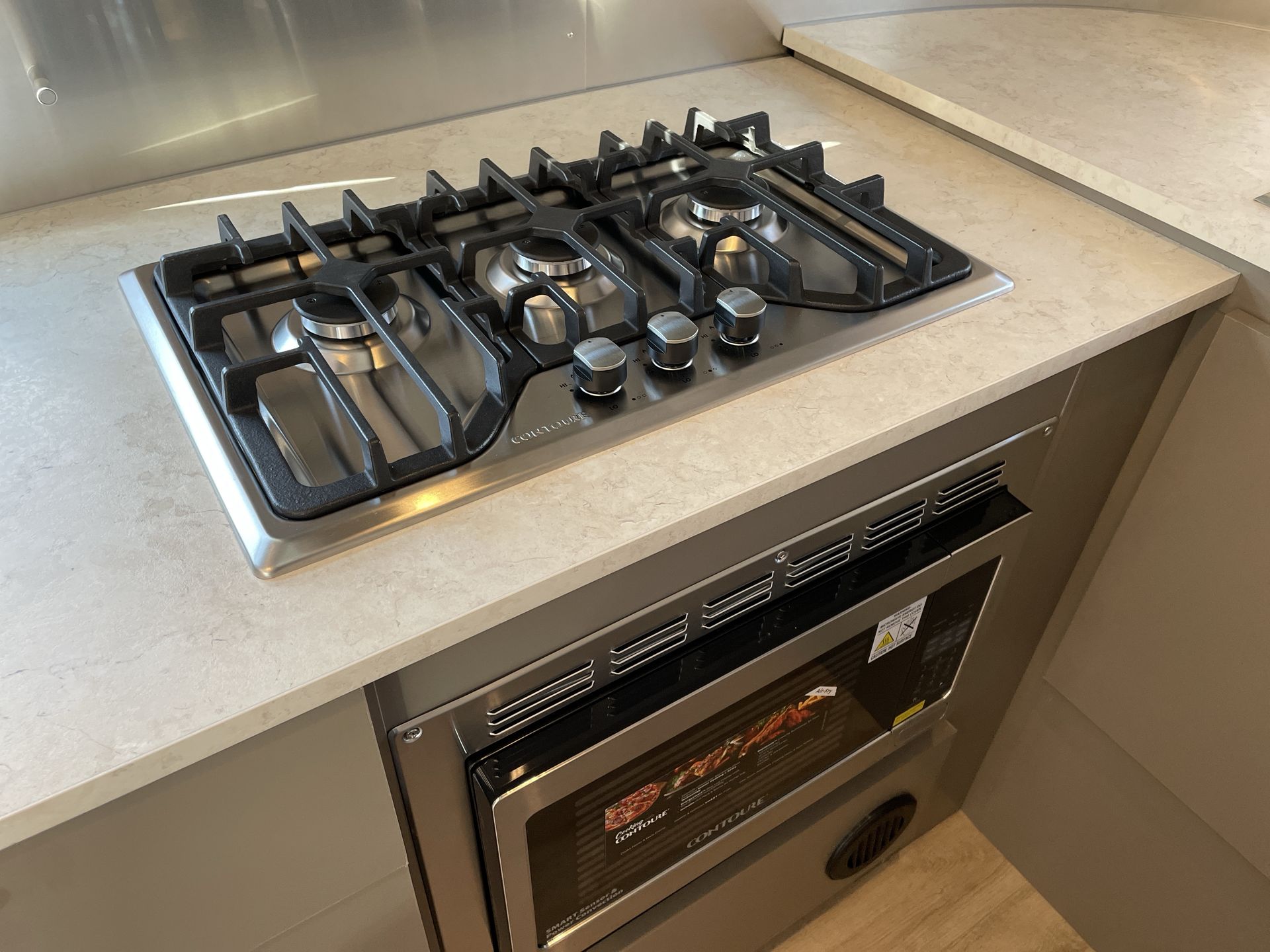 Inside, the 20FB features a thoughtfully designed floor plan that maximizes every inch of space. The front bedroom includes a cozy double bed with ample under-bed storage, providing a restful retreat after a day of exploration. The rear kitchen is equipped with a three-burner stove, convection microwave, and a compact refrigerator, making meal preparation convenient and enjoyable. The central dinette offers a comfortable area for dining or relaxation and can convert into additional sleeping space for guests.