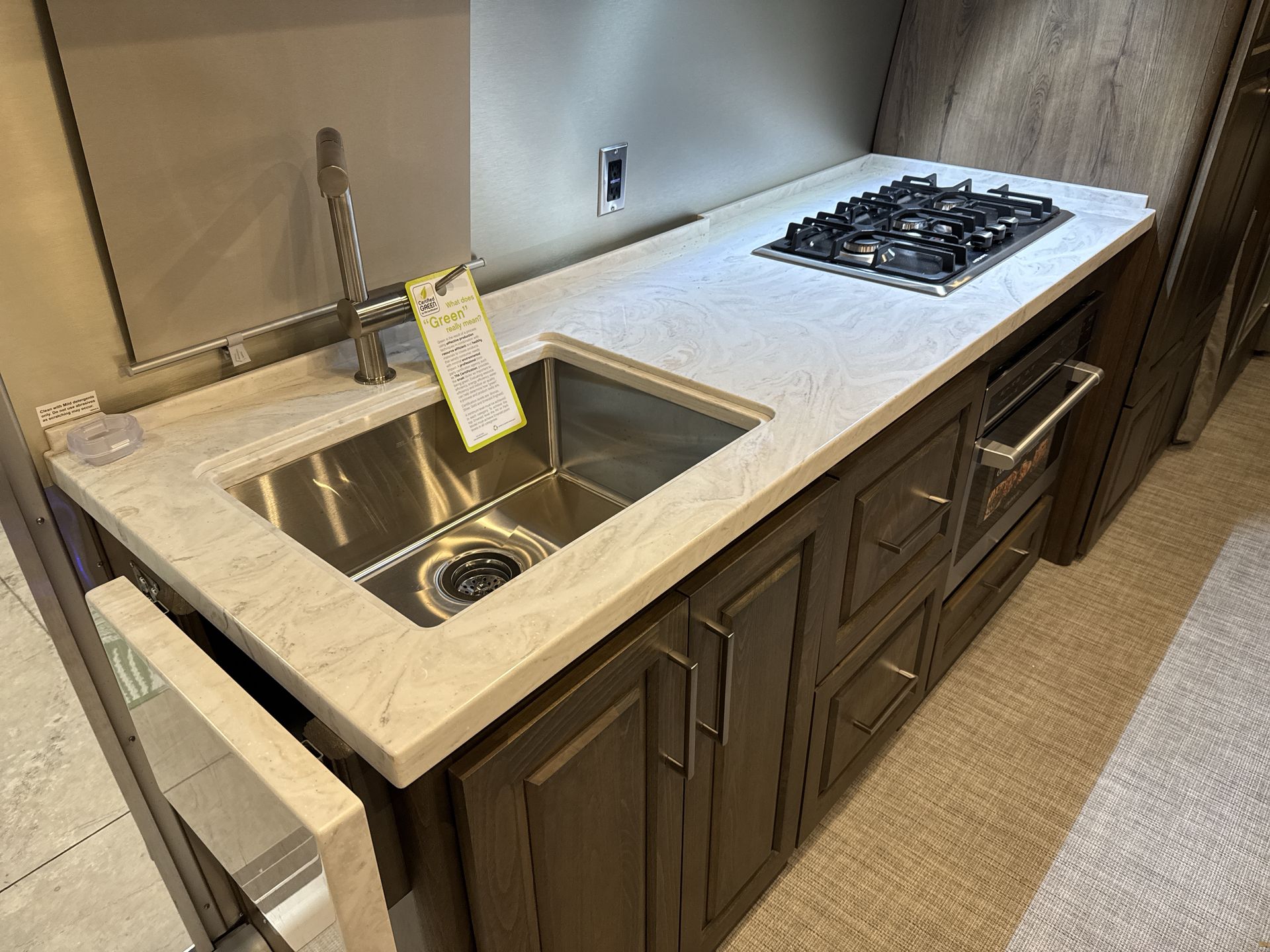 The kitchen is equipped with high-end appliances, including a three-burner gas stove, oven, convection microwave, and a mid-size refrigerator, facilitating easy meal preparation. The large stainless steel sink and generous counter space enhance the cooking experience. A powered dinette comfortably seats four and can convert into an extra sleeping area with the touch of a button.