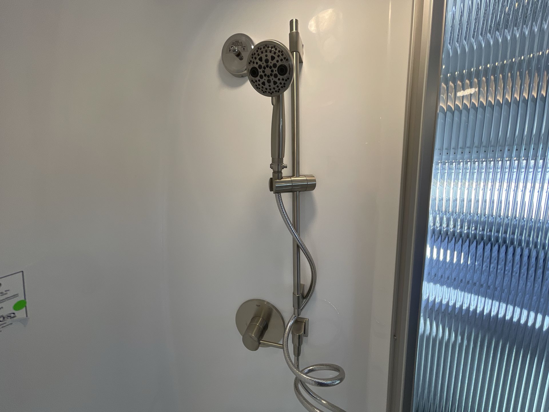 Climate control is managed by an efficient heating and cooling system, including a Quietstream™ climate control system, ensuring a comfortable environment regardless of the weather. The bathroom includes a spacious shower, a vanity with ample counter space, and a porcelain toilet, offering the conveniences of home.
