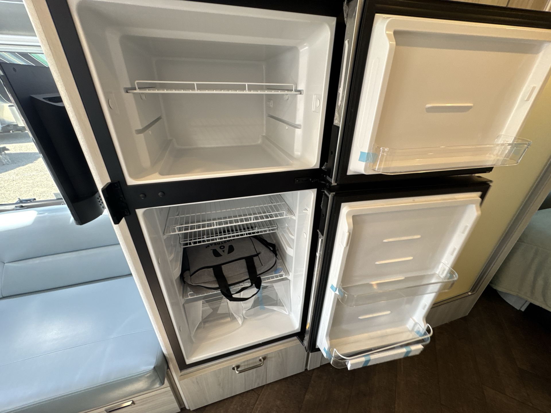 Inside, the 25FB Queen is designed to maximize space and comfort. The front houses a queen-sized bed, strategically placed for optimal weight distribution. Panoramic windows surround the sleeping area, filling the interior with natural light and offering stunning views.