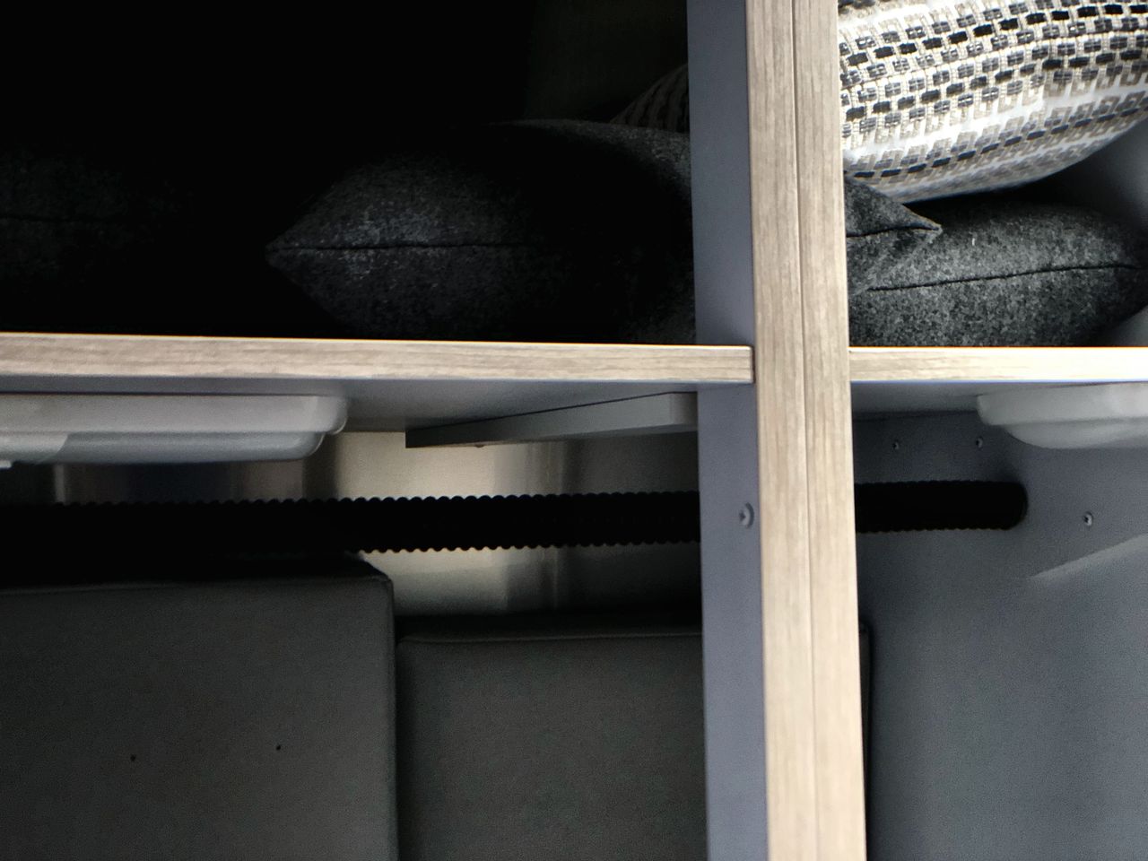 At the rear, the bedroom features a comfortable queen-size bed with plush bedding. Surrounding storage options, such as overhead compartments and spacious wardrobes, provide ample space for your belongings. Large windows allow natural light to fill the room, creating a peaceful setting for rest after a day of adventure.