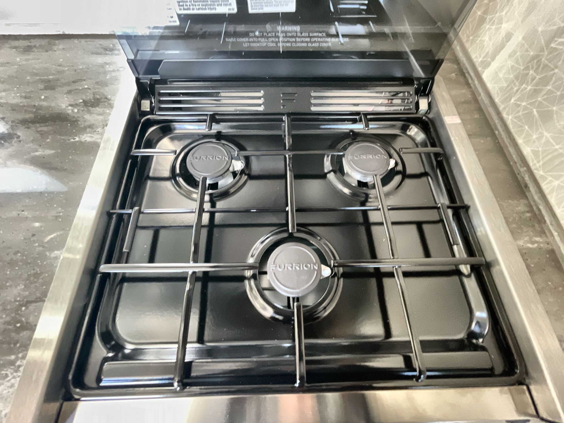 The kitchen is equipped with high-quality appliances, including a three-burner stove, convection microwave, and mid-size refrigerator, making meal preparation convenient and enjoyable. Ample storage is available with overhead cabinets and drawers, ensuring all your essentials are neatly organized.