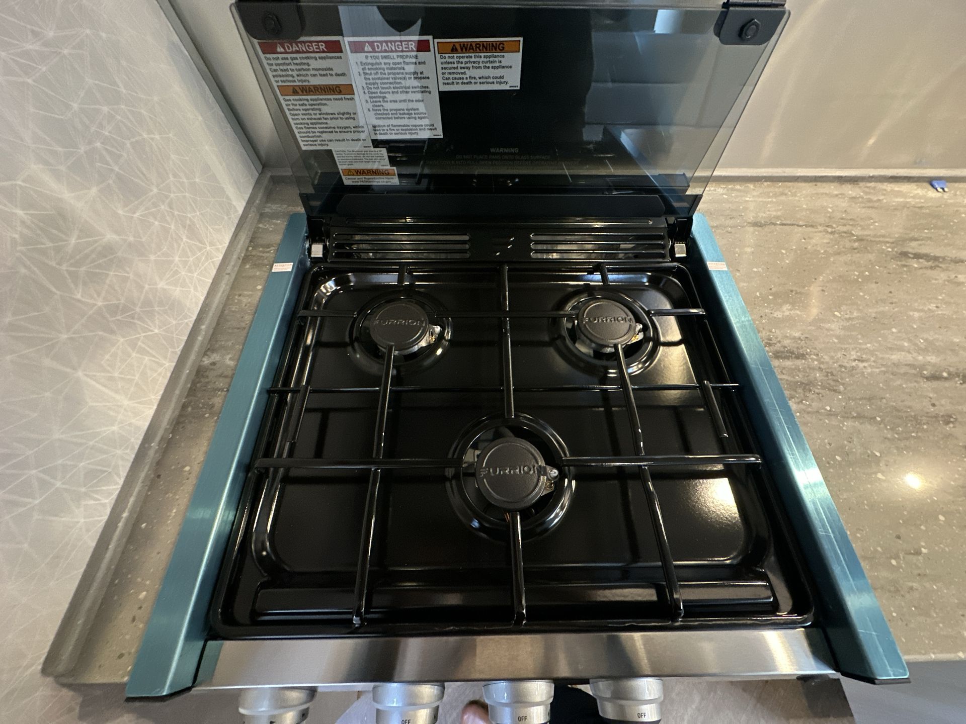 The 2024 Airstream International 27FB Twin is a 28-foot travel trailer designed for comfort and convenience. Its aluminum exterior enhances durability and fuel efficiency. Inside, the front bedroom features twin beds with under-bed storage and a wardrobe with a hanging bar. The kitchen includes a three-burner stove, oven, microwave, and an 8 cu. ft. refrigerator, along with ample cabinetry and counter space. The dinette comfortably seats four and converts into additional sleeping space. The bathroom is split, with a toilet and vanity on one side and a separate shower across the hall. Panoramic windows provide natural light and scenic views. Additional features include a climate control system, LED lighting, and a sound system with Bluetooth® connectivity. The 27FB Twin offers a comfortable and functional space for travelers.