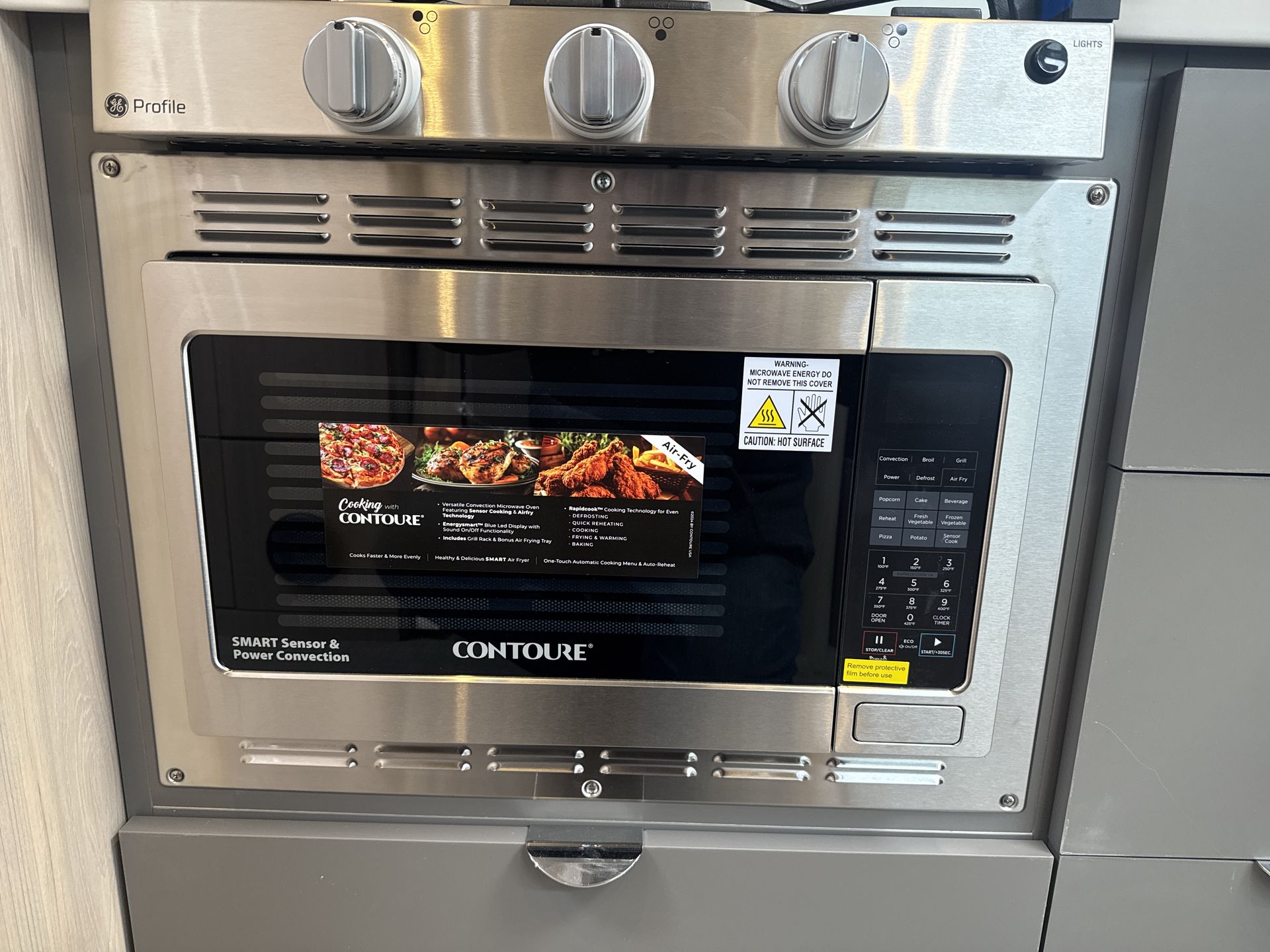 The living area is both functional and inviting, with modern furnishings and high-end appliances ensuring relaxation in style. The kitchen is fully equipped with stainless steel appliances, including a gas stove, oven, and microwave, making meal preparation a breeze. Corian countertops and clever storage options enhance the kitchen's practicality and aesthetics.