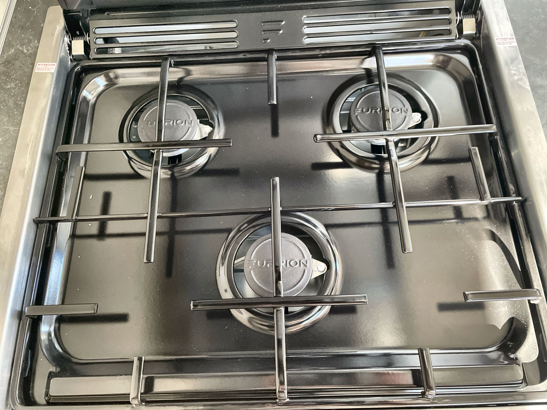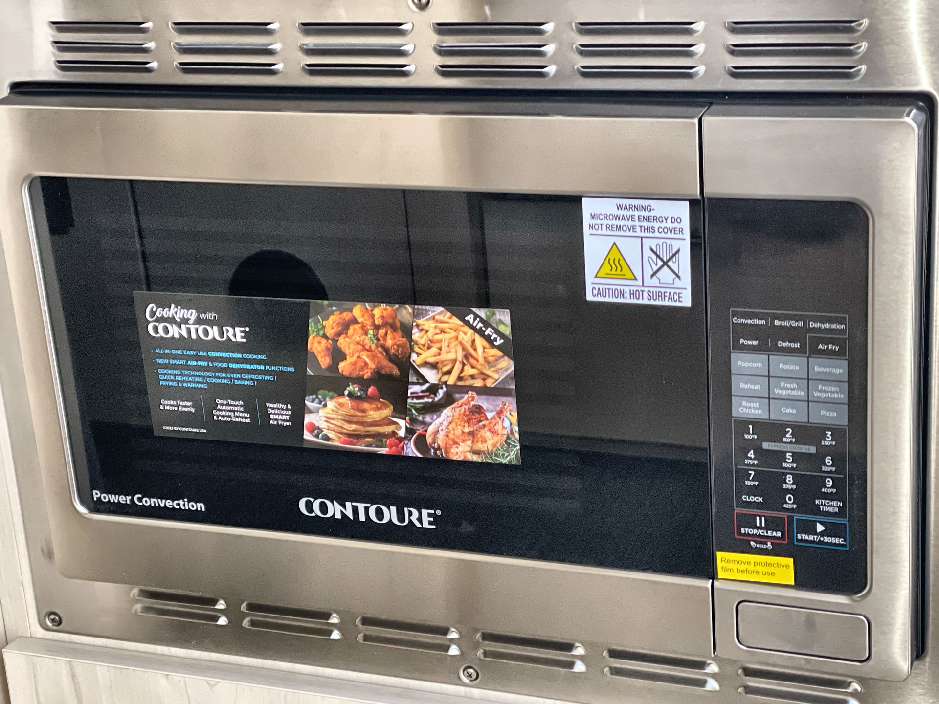 The well-equipped kitchen boasts a three-burner stove, oven, microwave, and a spacious refrigerator, allowing for enjoyable meal preparations on the road. The split bathroom design features a separate shower and a half-bath with a toilet and vanity, providing convenience and privacy.