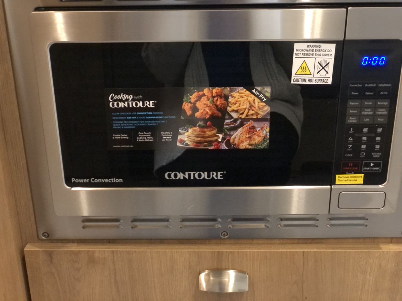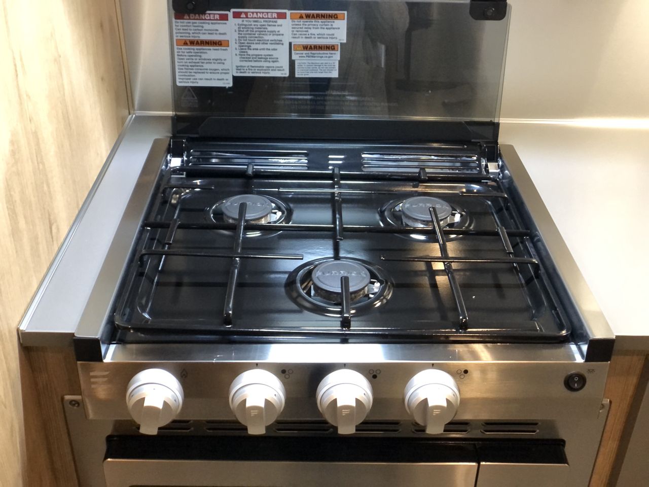 The living area includes plush seating and a versatile dinette that can convert into additional sleeping space, accommodating up to five people comfortably. The kitchen is equipped with premium appliances, including a three-burner cooktop, an 8 cu. ft. 12V electric refrigerator, and an optional convection microwave, allowing you to prepare meals with ease. Handcrafted cabinetry provides ample storage, keeping the interior organized and clutter-free.