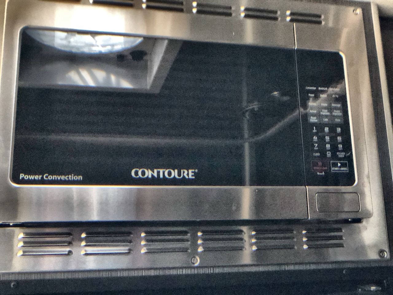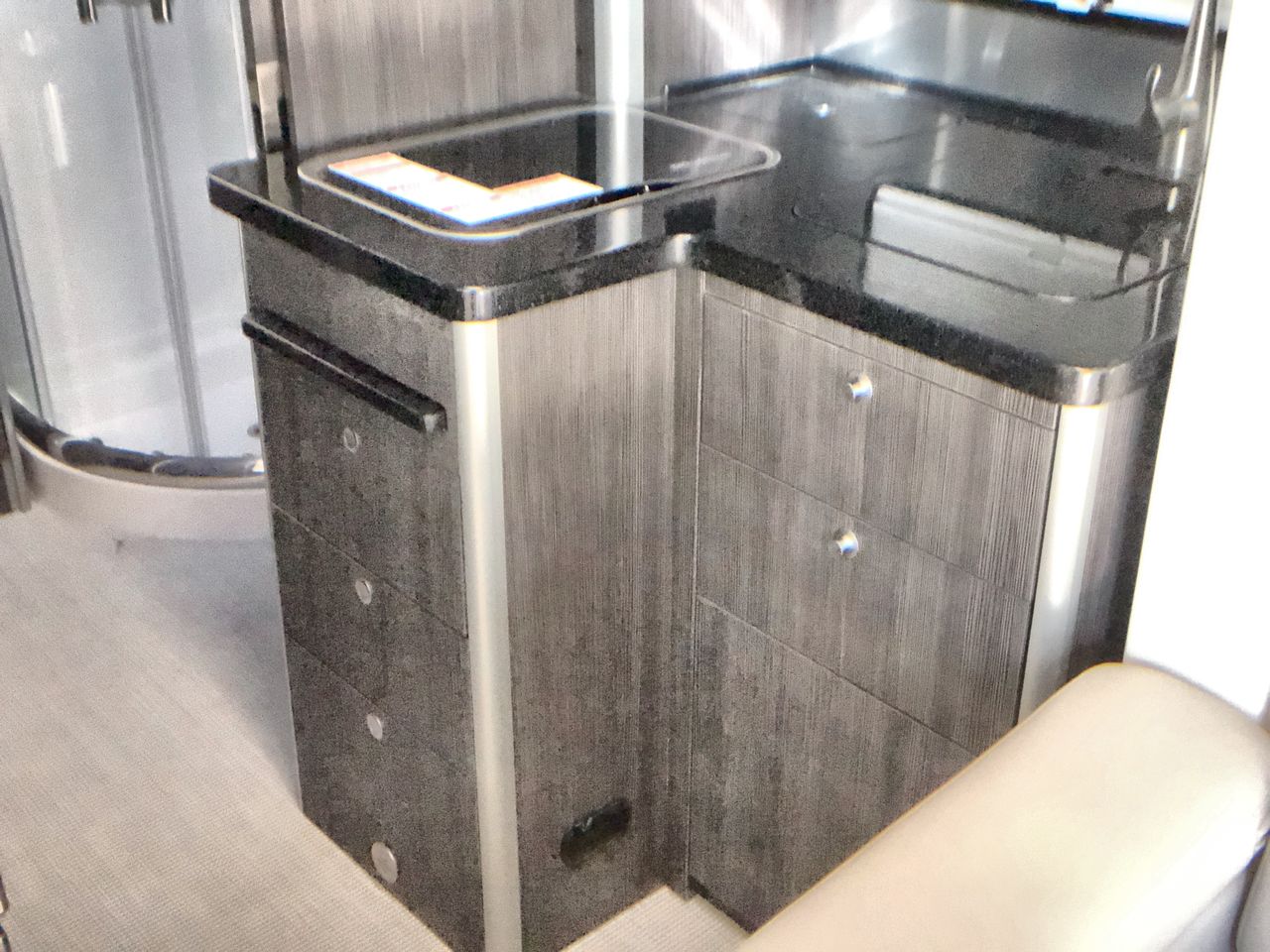 The kitchen is equipped with high-end appliances, including a two-burner gas stove, a convection microwave oven, and a mid-size refrigerator with a freezer. Solid-surface countertops, a large stainless steel Kohler® sink, and a slide-out pantry enhance both functionality and style, making it easy to prepare homemade meals on the road.