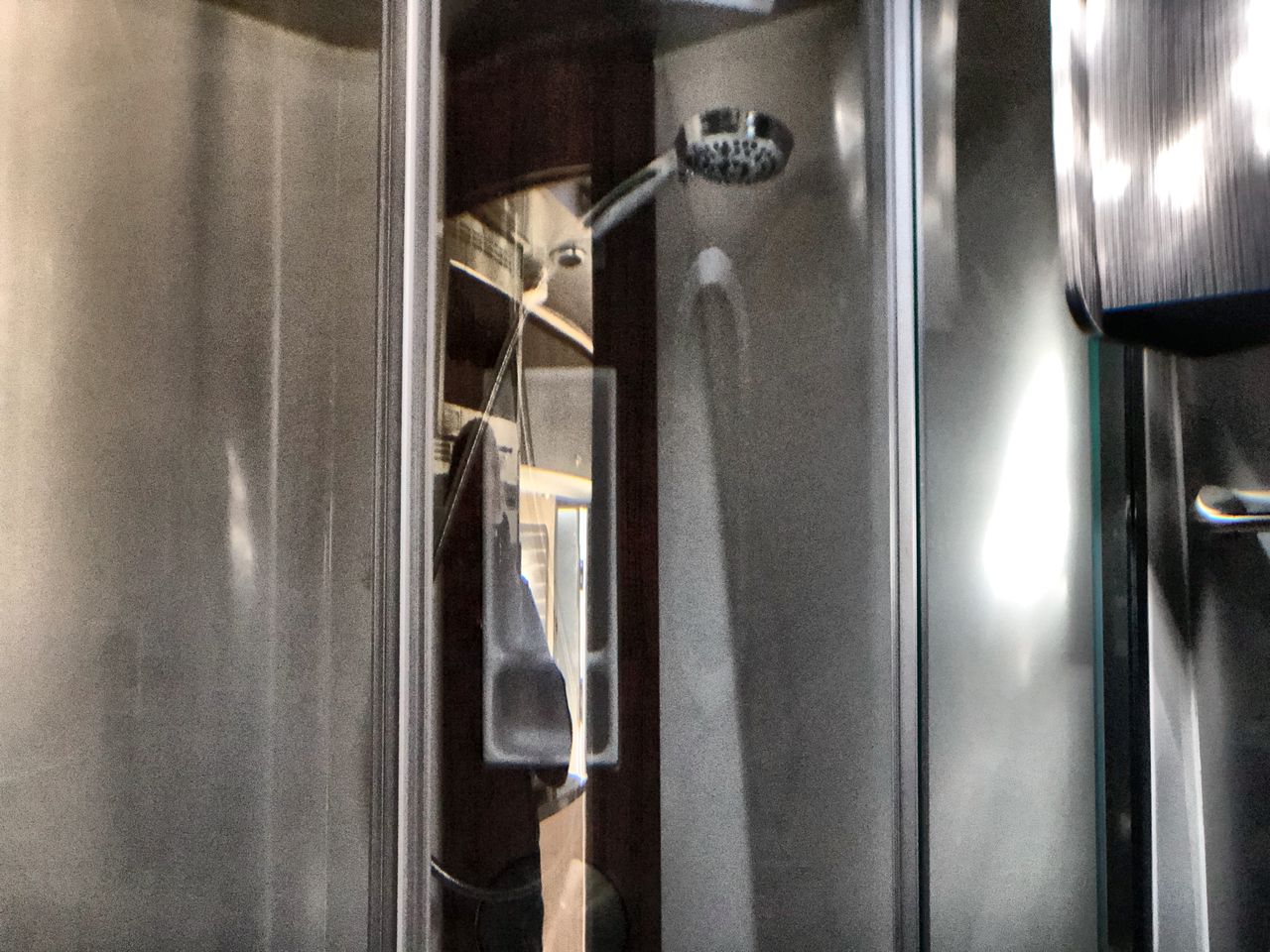 The full bathroom spans the entire rear of the RV, offering a spa-like retreat with a spacious shower featuring a teak inlay, a porcelain toilet, and a large vanity with a mirrored cabinet. A cedar-lined closet inside the bathroom provides ample storage, and a single door closes off the space for privacy.